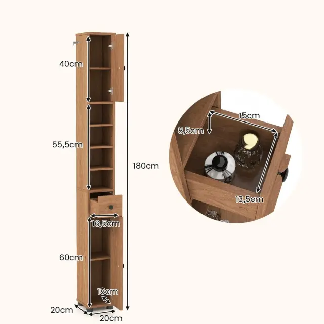 Odlična za majhne prostore: Ta ozka kopalniška omarica, ki varčuje s prostorom, meri le 20 x 20 cm (D x Š) in je zasnovana tako, da se prilega ozkim prostorom in vogalom. S to vsestransko visoko omarico, ki vam omogoča, da kar najbolje izkoristite razpoložljivi prostor, optimizirate tudi prostor v kopalnici, spalnici, dnevni sobi ali kuhinji.