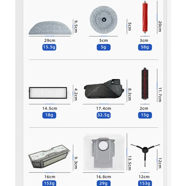 Izboljšana učinkovitost čiščenja: paket vključuje nadomestne dele, kot so glavne krtače, stranske krtače in filtri, zasnovani za ohranjanje učinkovitosti čiščenja vašega sesalnika Roborock. Redna menjava preprečuje obrabo in zagotavlja, da vaš robot še naprej čisti z optimalno učinkovitostjo.