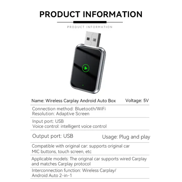 Izboljšana uporabniška izkušnja: Ta brezžični Carplay in Android Auto adapter preoblikuje vašo vozniško izkušnjo s prinašanjem integracije pametnega telefona na zaslon vašega avtomobila. Uživajte v poenostavljenem in intuitivnem vmesniku, ki zrcali bistvene aplikacije vašega telefona neposredno na zaslonu vašega avtomobila. Izkoristite zmožnosti glasovnega upravljanja s Siri ali Google Assistant, ki vam omogočata upravljanje klicev, pošiljanje besedil in navigacijo, ne da bi umaknili roke z volana. Združljiv z originalnim avtomobilskim mikrofonom, gumbi in upravljanjem na dotik za enostavno in znano uporabo.