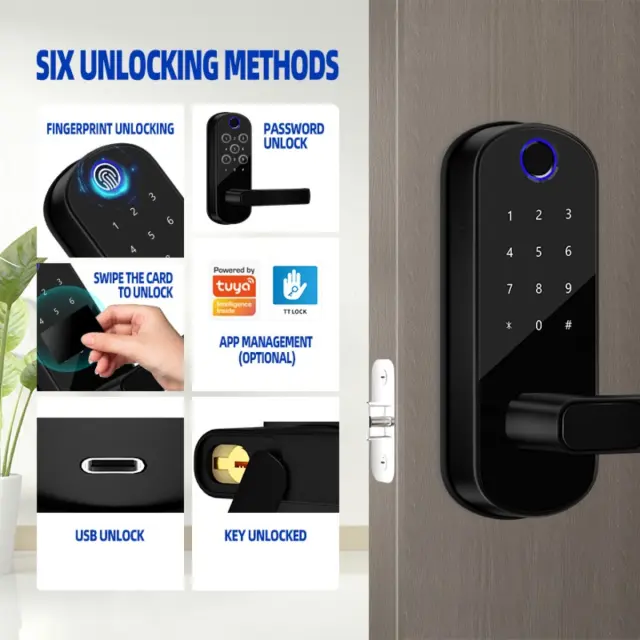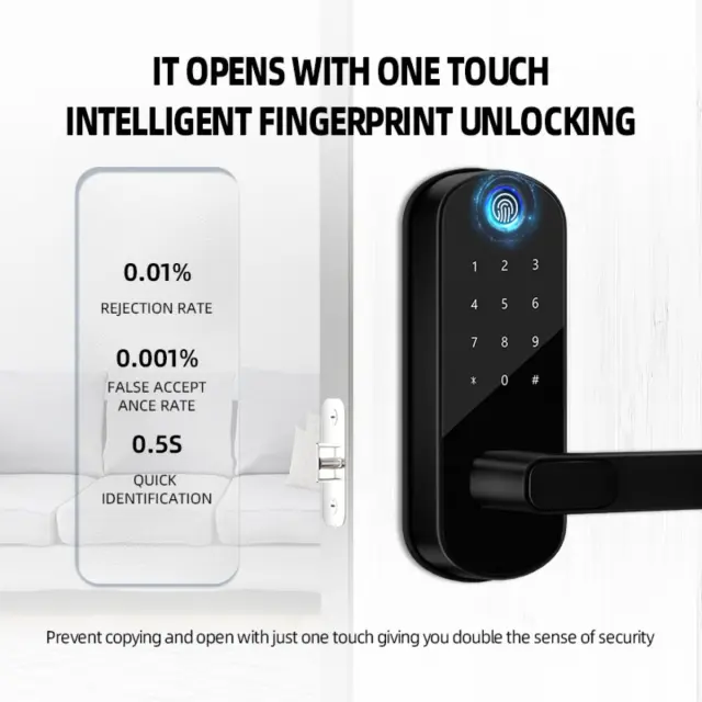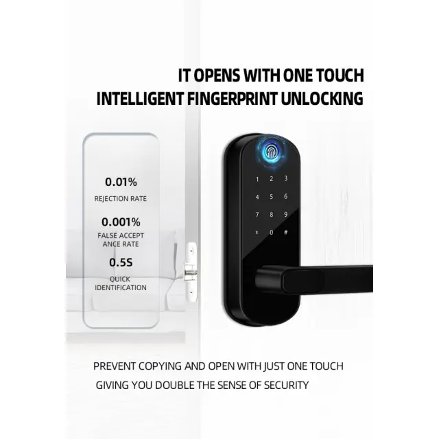 Večplastna varnost: Ta pametna ključavnica za vrata s prstnim odtisom zagotavlja več plasti varnosti, združuje prepoznavanje prstnih odtisov, tipkovnico za geslo in fizično varnostno kopijo ključa. S kapaciteto 50 prstnih odtisov in zmožnostjo vzdržati 100.000 ciklov odklepanja zagotavlja zanesljivo in robustno zaščito pred nepooblaščenim dostopom. Idealna za zaščito vašega doma, stanovanja, hotelske sobe ali pisarniškega prostora, nudi brezskrbnost in izboljšane varnostne funkcije. Napredna tehnologija šifriranja preprečuje vdor in zagotavlja, da lahko vstopijo samo pooblaščene osebe.