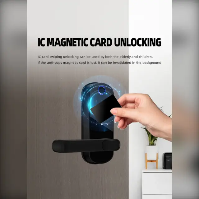 Vsestranska uporaba: Ta pametna ključavnica s prstnim odtisom, zasnovana za notranja lesena vrata, je primerna za široko paleto aplikacij, vključno s hoteli, stanovanji, domovi in pisarnami. Njena elegantna in moderna oblika dopolnjuje vsako notranjo opremo, medtem ko njen enostaven postopek namestitve ne zahteva vrtanja, zaradi česar je nadgradnja vašega obstoječega varnostnega sistema brez težav. Delovanje na baterije zagotavlja, da ključavnica ostane funkcionalna tudi med izpadi električne energije, kar zagotavlja neprekinjeno varnost in udobje. Zaradi svoje prilagodljivosti je odlična izbira za različne nastavitve.