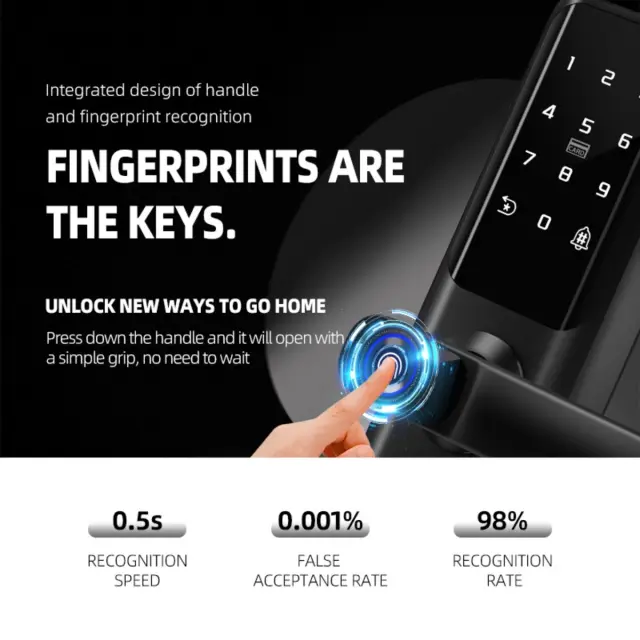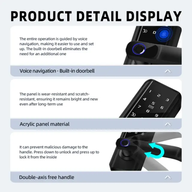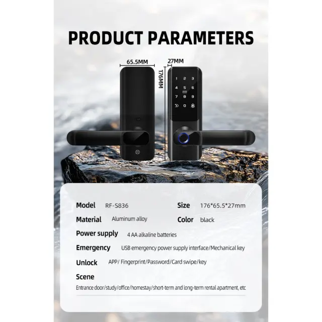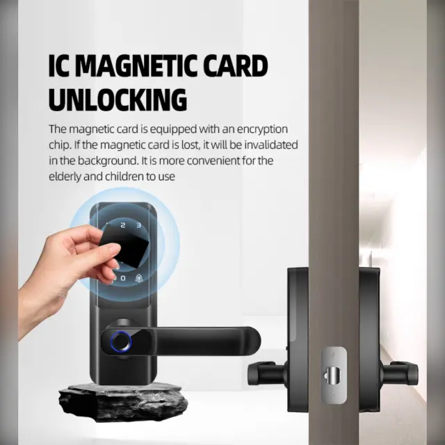Vsestranski scenariji uporabe: Ta pametna ključavnica s prstnim odtisom, zasnovana za notranja lesena vrata, je primerna za široko paleto aplikacij, vključno z domovi, stanovanji, hoteli in šolami. Njena elegantna in moderna oblika dopolnjuje vsako notranjo opremo, medtem ko njene napredne varnostne funkcije zagotavljajo zanesljivo zaščito pred nepooblaščenim dostopom. Ključavnica je enostavna za namestitev in uporabo, njena dolga življenjska doba baterije pa zagotavlja, da bo zanesljivo delovala leta. S svojimi več načini vstopa, zmožnostmi daljinskega upravljanja in podporo za glasovno navigacijo je ta pametna ključavnica za vrata odlična izbira za vse, ki želijo izboljšati varnost in udobje svoje lastnine. Ključavnica podpira 100.000 odklepanj.