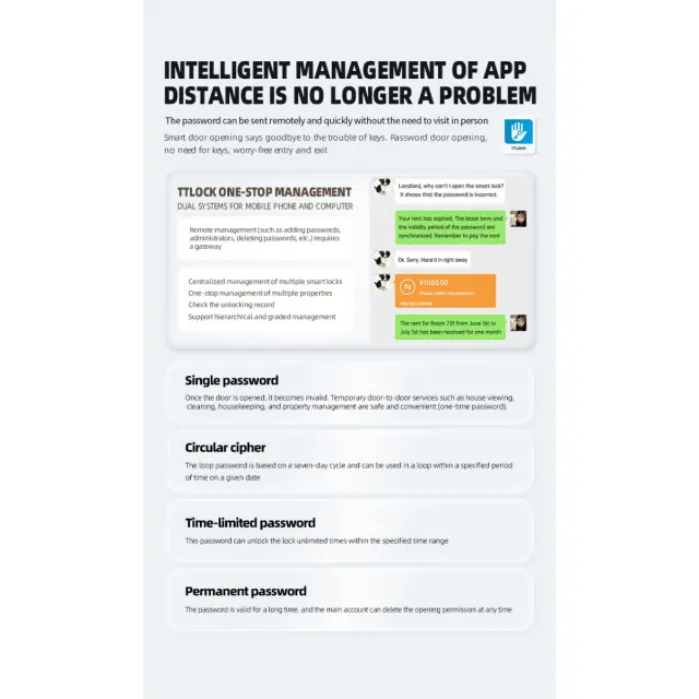 Priročno daljinsko upravljanje: Funkcija daljinskega odklepanja te pametne ključavnice za vrata vam omogoča, da odobrite dostop obiskovalcem, družinskim članom ali servisnemu osebju od koder koli s pametnim telefonom. To je še posebej uporabno, ko vas ni doma ali ko morate nekomu zagotoviti začasen dostop. Ključavnica podpira tudi glasovno navigacijo v 9 jezikih, kar uporabnikom iz različnih okolij olajša upravljanje sistema. Integrirano zvonec dodaja dodatno raven udobja, saj vam omogoča, da vidite in se pogovarjate z obiskovalci, preden jim odobrite dostop. Ta kombinacija daljinskega upravljanja in podpore za več jezikov naredi to pametno ključavnico za vrata vsestransko in uporabniku prijazno varnostno rešitev.