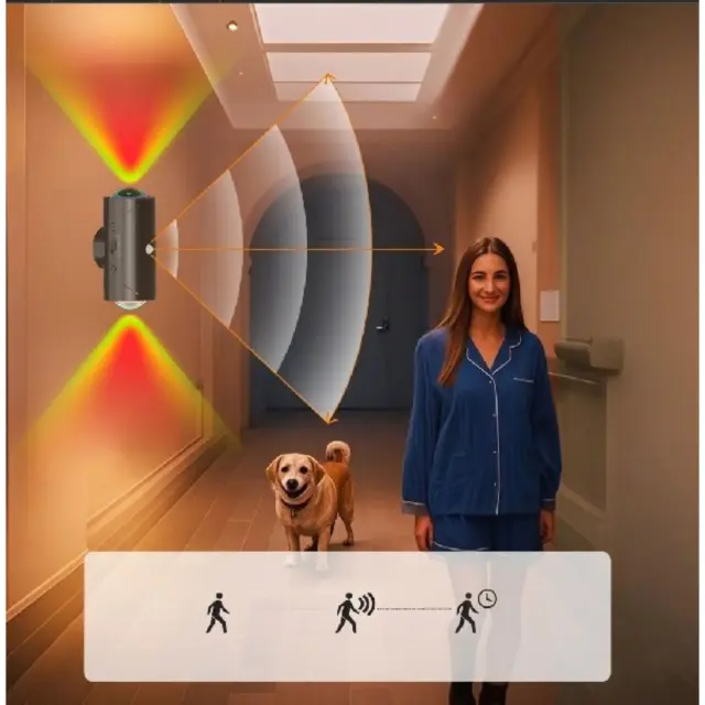 Zazna gibanje ljudi v temnih prostorih in se prižge za 15 sekund, nato se izklopi za varčevanje z energijo.