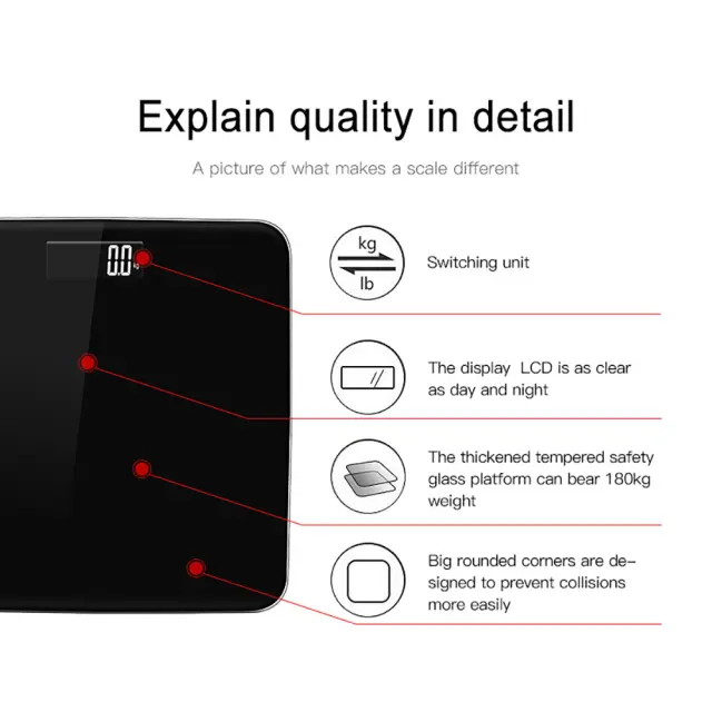 Kaljeno steklo: Izdelana s 6 mm debelo platformo iz kaljenega stekla, ta tehtnica ponuja izjemno trdnost in varnost. Robusten stekleni material lahko prenese največjo težo 180 kg, kar zagotavlja varno in zanesljivo tehtalno površino. Kaljeno steklo je tudi odporno na razbitje, kar nudi dodatno zaščito pred nenamernimi poškodbami. Gladka površina, ki jo je enostavno očistiti, zagotavlja higieno in enostavno vzdrževanje, zaradi česar je praktičen in dolgotrajen dodatek vaši kopalnici.