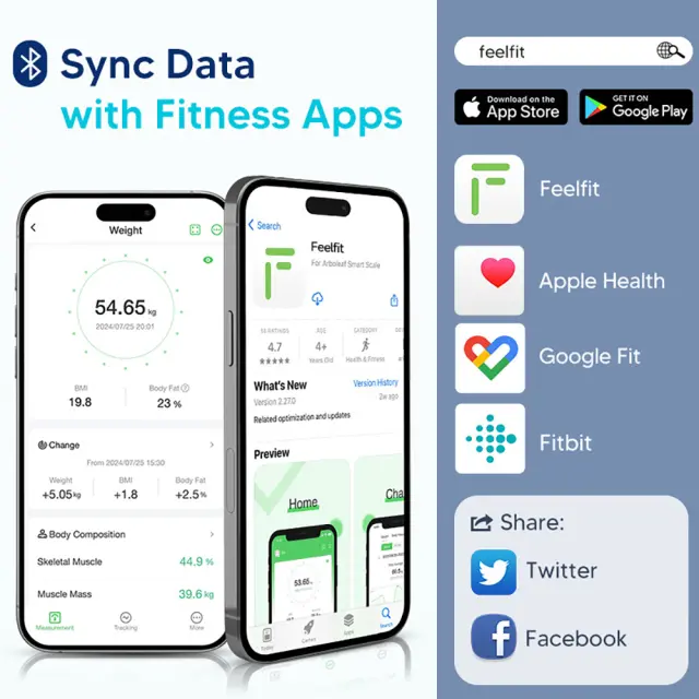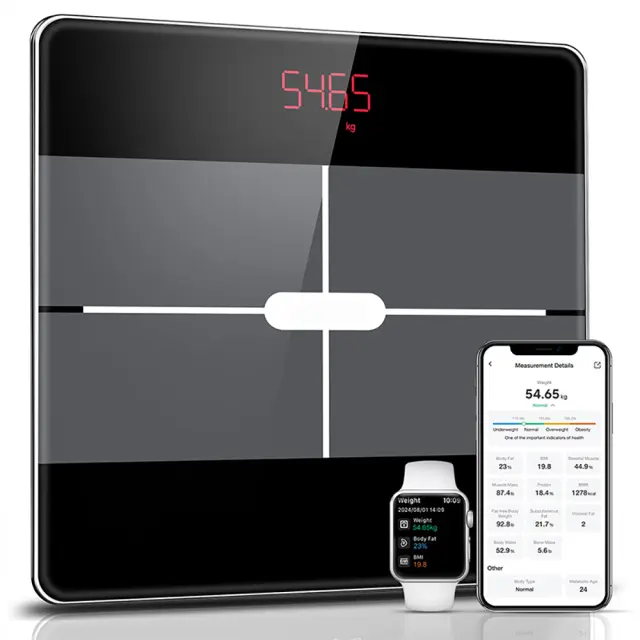 Celovita analiza telesa: Pametna tehtnica zagotavlja podrobno analizo vaše telesne sestave, ki presega zgolj težo. Meri odstotek telesne maščobe, mišično maso, odstotek vode in še več, kar vam daje popolno sliko vašega zdravja in napredka pri telesni pripravljenosti. Ti podrobni podatki vam pomagajo bolje razumeti svoje telo in sprejemati informirane odločitve o prehrani in vadbi. Sledite svojemu napredku skozi čas in si oglejte rezultate svojega trdega dela.