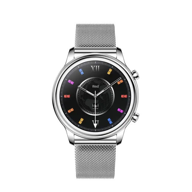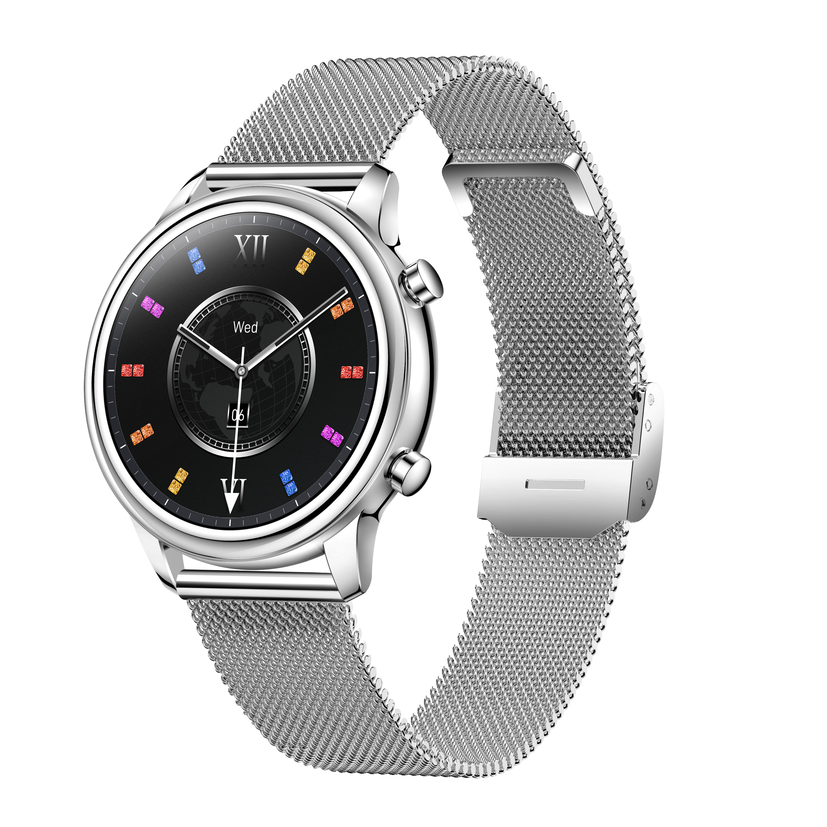 Eleganten in funkcionalen: Pametna ura se ponaša z elegantno in moderno zasnovo s srebrnim zaključkom, zaradi česar je popoln dodatek za vsako priložnost. Zaradi lahke in udobne zasnove jo lahko nosite ves dan brez nelagodja.