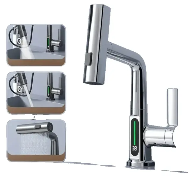 Pametni digitalni prikaz umivalni pipa, občutljiva na temperaturo, funkcionalnost izvlečenja, krom