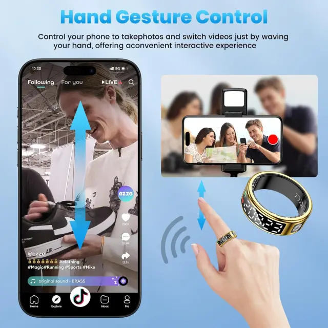 Pametno upravljanje s kretnjami: Pametni prstan ima vgrajeno upravljanje s kretnjami. Preprosto nosite prstan in dvakrat tapnite s prstom, da preklopite videoposnetke ali posnamete fotografije. Ta intuitivni nadzor izboljša vašo uporabniško izkušnjo, kar olajša upravljanje vaših naprav in medijev. Funkcija pametnih kretenj dodaja plast udobja vašim vsakodnevnim aktivnostim.