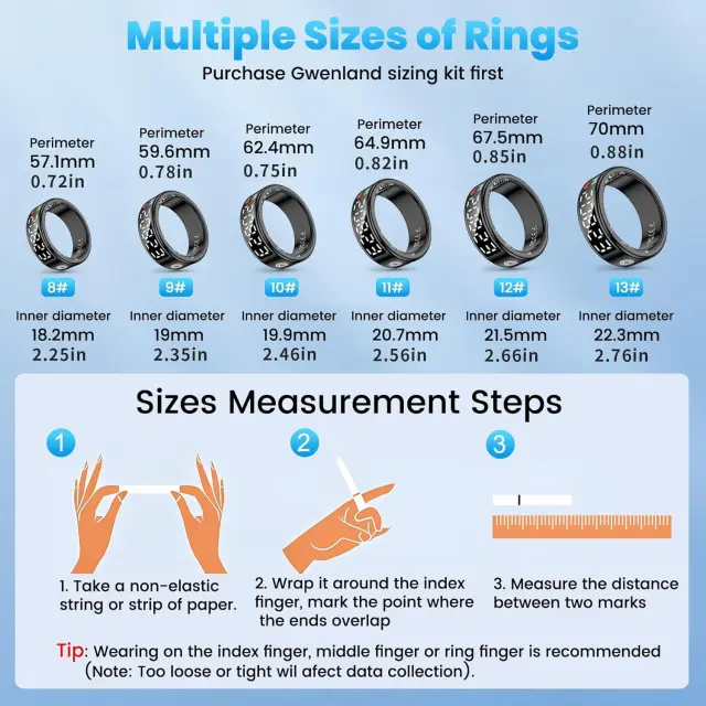 Spremljanje zdravja: Pametni prstan zagotavlja celovito spremljanje zdravja, vključno s srčnim utripom in nivojem kisika v krvi. To vam omogoča priročno in neprekinjeno spremljanje vaše telesne pripravljenosti in dobrega počutja ves dan in noč. Bodite obveščeni o delovanju svojega telesa in sprejemajte proaktivne odločitve za izboljšanje splošnega zdravja.