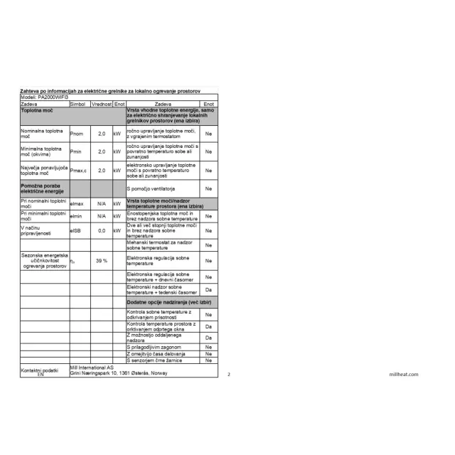 MILL PA2000WIFI3V 2000W panelni konvekcijski radiator