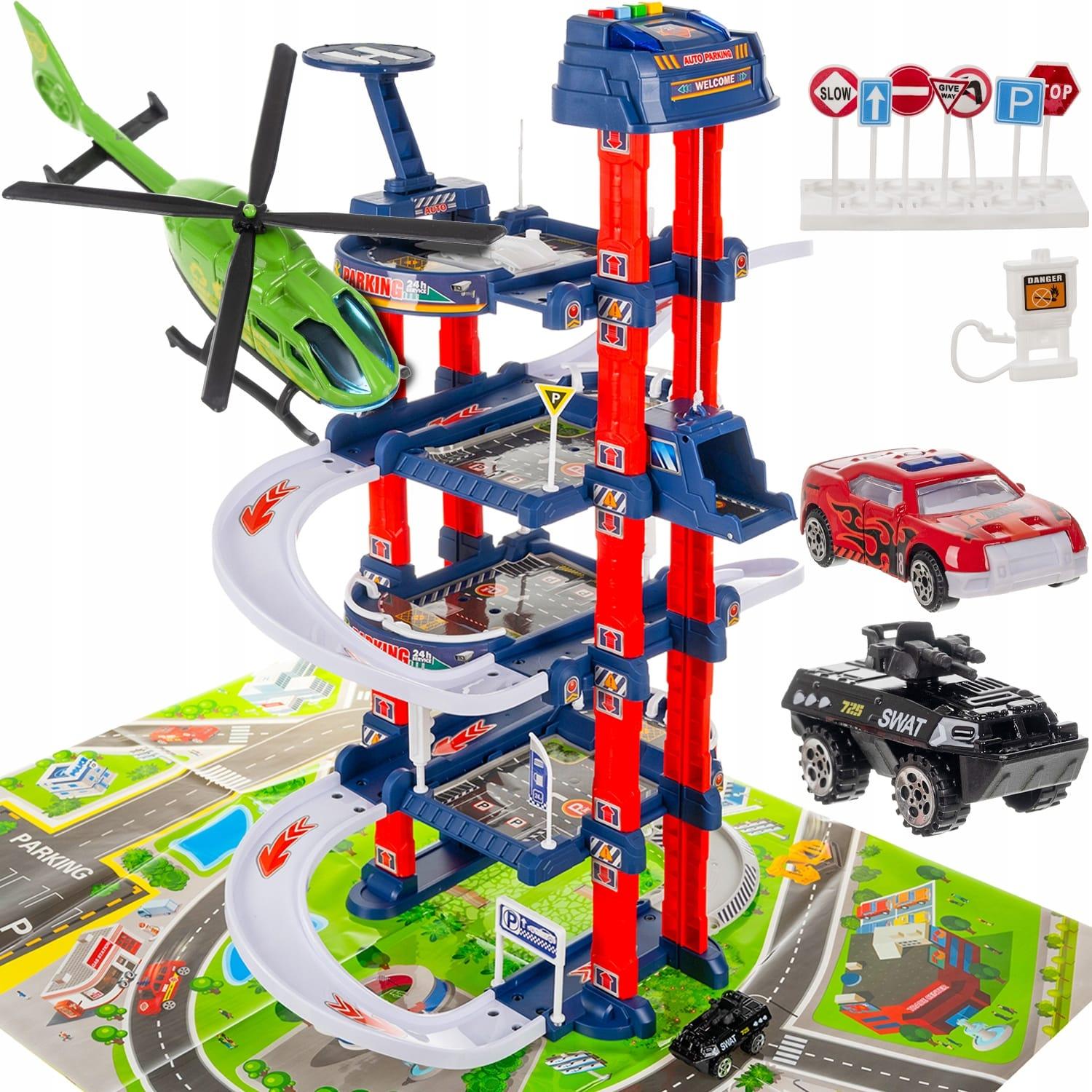 - FUNKCIONALEN IN MODEREN DIZAJN – na vrhu garaže je pristajališče za helikopter, ki igri doda realističnost in popestri igralne scenarije. Vsak nivo garaže je zavarovan z ovirami , ki ščitijo avtomobile pred izpadom, ustrezno postavljeni prometni znaki pa vam omogočajo, da sami oblikujete prometna pravila. Popolnoma oblikovana proga z ovirami, ki vodi od samega vrha, omogoča nemoten spust avtomobilov , kar zagotavlja razburljivo vožnjo. Poleg tega dvignjen kanal na najvišjo raven je odličen dodatek, ki omogoča kreativne rešitve in dodatne možnosti zabave.