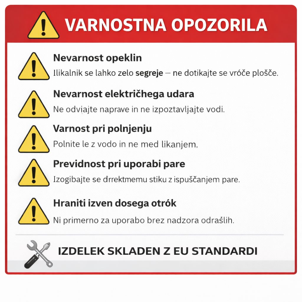 Pred uporabo preberite navodila. Vroče površine in para lahko povzročijo opekline. Hranite izven dosega otrok.