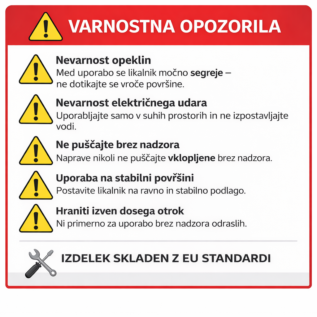 Pred uporabo preberite navodila. Vroče površine in para lahko povzročijo opekline. Hranite izven dosega otrok.