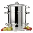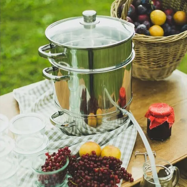 Baumalu parni sokovnik je idealen za pripravo popolnoma bistrega soka iz sadja ali zelenjave, pripravo želeja, marmelade, džemov, kompota in pireja. Pri ekstrakciji soka iz sadja se ohranijo naravni sladkorji, kisline, hranila, vitamini in edinstvena aroma. Trojno inkapsulirano dno omogoča popolno ekstrakcijo. 3-delna posoda z ročaji je izdelana iz kakovostnega nerjavečega jekla, toplotno odporen steklen pokrov z obodom iz nerjavečega jekla pa zadržuje paro ter omogoča vpogled v posodo. V spodnjo posodo nalijte vodo, v perforirano pa naložite sadje ali zelenjavo (jabolka, jagodičevje, koprive, grozdje …). V kolikor vam je všeč sladkejši okus, dodajte k sadju oz. zelenjavi sladkor. Posodo pokrijte s pokrovom in segrejte vodo. Uporabite jo lahko na vseh kuhalnih površinah (električna, plinska, steklokeramična ali indukcijska plošča). Ko voda zavre, začne para pronicati skozi živilo in pri temperaturi 80 – 90° C popokajo celične membrane (olupek), zaradi česar se začne sproščati sok, ki se zbira v posodi s cevjo (kapaciteta 2,7L), ki je namenjena polnjenju steklenic ali kozarcev. Posoda za vodo mora biti dovolj napolnjena in ves čas enakomerno vreti. Za razliko od navadnega sokovnika je nastali sok segret oz. pasteriziran. Pri tem del vitaminov termično razpade, vendar je obstojnost bistveno daljša, zato ga lahko shranite v steklenice. Cev odprete šele, ko začnete sok pretakati iz posode. V kolikor želite kašast ostanek spremeniti v marmelado ali kompot, morate sadju oz. zelenjavi predhodno odstraniti peclje, liste, peške ali koščice. Sokovnik je primeren za pomivanje v pomivalnem stroju.