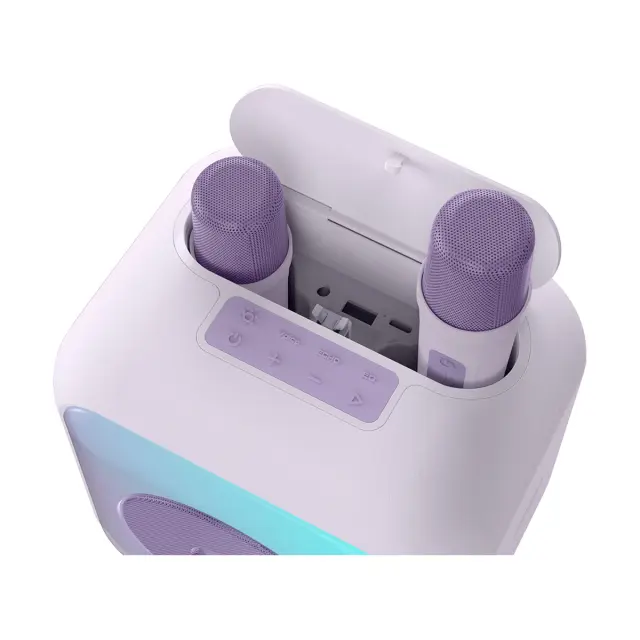 S skupno glasbeno močjo 30 W zagotavlja jasen, močan in uravnotežen zvok.. Vključno z dvema brezžičnima mikrofonoma za polnjenje, ki omogočata organizacijo nepozabnih duetov in divjih pevskih bitk.. Projekcija dinamičnih, barvitih svetlobnih učinkov, ki se ujemajo z vašo glasbo in poženejo plesišče.. Učinek odmeva doda profesionalno razsežnost vašemu petju, funkcija prednostnega glasu pa vaš glas postavi v središče pozornosti in omogoča karaoke, vredne profesionalcev..
