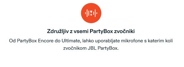 Kardioidni vzorec zajemanja mikrofonov zagotavlja topel, jasen in čist vokalni zvok, ki je zasnovan tako, da vsakdo zveni najbolje s katerim koli JBL PartyBox-om.