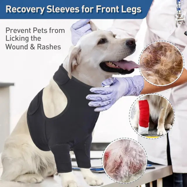Zaščita po operaciji: Prosimo, upoštevajte: to niso originalni deli. Zagotovite, da si vaš pasji spremljevalec udobno opomore z našimi rokavi za zaščito sprednjih nog. Ti rokavi preprečujejo pretirano lizanje in praskanje ran ali povojev, zmanjšujejo tveganje za okužbo in pospešujejo celjenje. Zračna tkanina ohranja območje suho in prezračevano, kar zmanjšuje nelagodje med obdobjem okrevanja. Idealni za pse, ki okrevajo po operaciji, poškodbah ali kožnih boleznih, ti rokavi zagotavljajo zaščitno pregrado pred samo-poškodbami in zunanjimi dražilnimi snovmi. Združljivi z različnimi pasmami in velikostmi, nudijo varno in prijetno prileganje za optimalno zaščito in mirnost. Je bistveni pripomoček za dobro počutje vašega psa in spodbuja brezstresen proces celjenja.