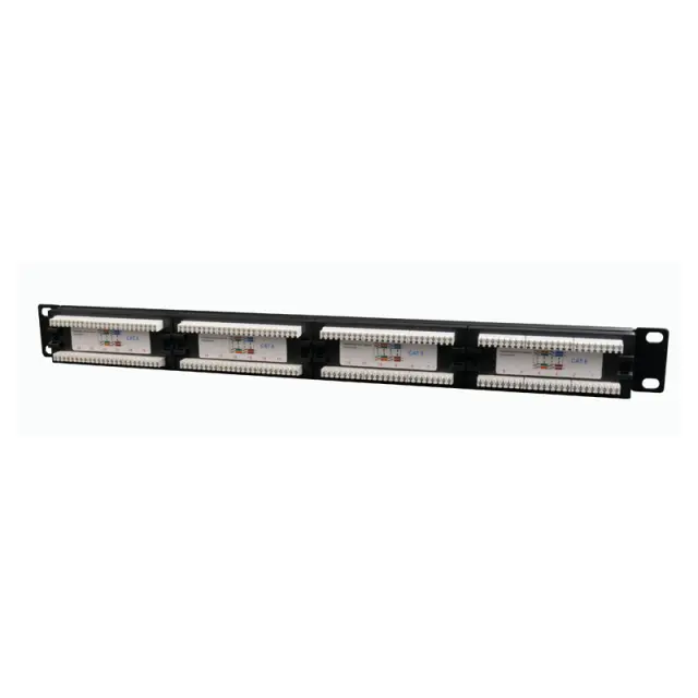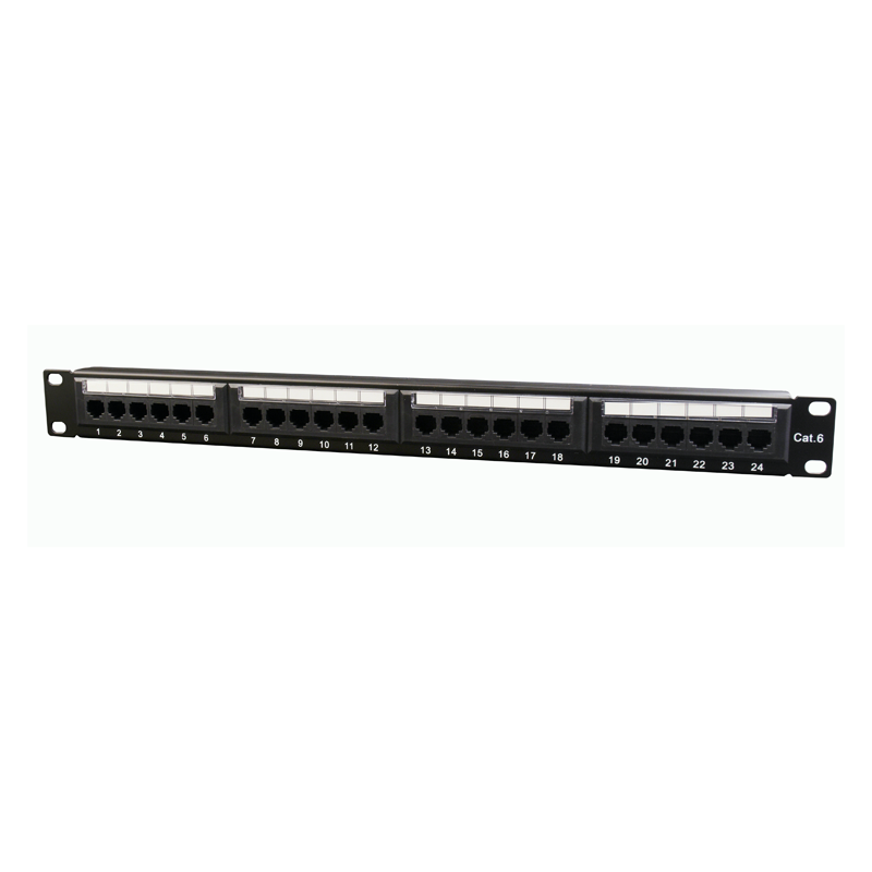 24-portni CAT6 patch panel, zasnovan za montažo v katero koli standardno 19'' rack omaro.