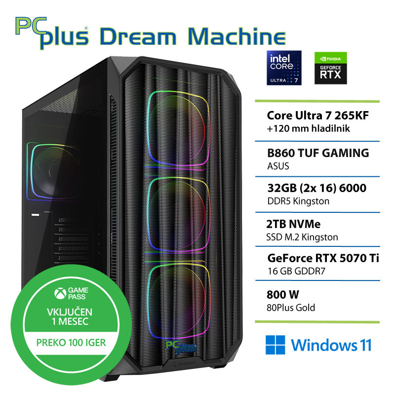 Gaming namizni računalnik PCPLUS Dream Machine, U7 265KF, 32 GB RAM, 2 TB SSD, RTX 5070Ti 16 GB, W11H + Xbox GP