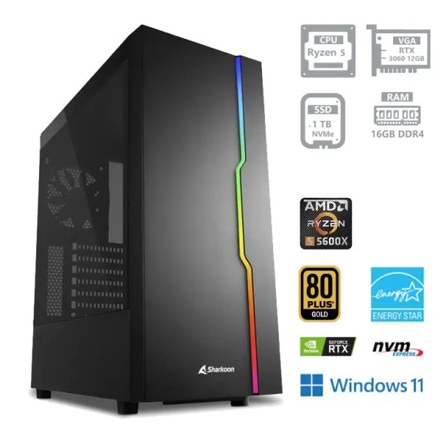 Osrednji del je AMD Ryzen 5 5600X procesor serije 5000 v sodelovanju z zmogljivo grafično kartico RTX 3060 12GB GDDR6. Za gladko sočasno delovanje več programov poskrbi 16 GB kakovostnega DDR4 pomnilnika. Vezni nabor AMD B550 osnovne plošče ponuja vse potrebne priključke za povezavo komponent. Tako računalnik brez težav poganja večino iger v 8K (7680x4320) ločljivosti z vsemi vklopljenimi podrobnostmi. Vgrajen je 1 TB NVMe SSD za bliskovit zagon sistema in najbolj priljubljenih iger.