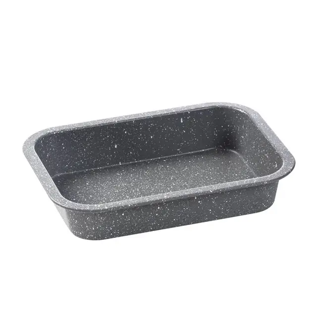 Pravokoten pekač je izdelan iz nerjavečega jekla, ki je prevlečen s prevleko proti prijemanju v imitaciji kamna. Primeren je za uporabo v pečici na temperaturi do 220°C. Ni primeren za uporabo v mikrovalovni pečici in pomivanje v pomivalnem stroju.