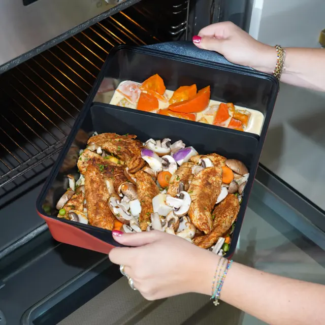Pozabite na cel kup različnih pekačev – tukaj je Incredible, edinstven nastavljiv pekač (39 x 26,5 cm), ki se popolnoma prilagaja vašim željam, količini sestavin in številu gostov. Zahvaljujoč pametnemu, patentiranemu separatorju iz silikona in kaljenega stekla, lahko v trenutku ustvarite popoln prostor za dve jedi – vse v eni sami posodi! Pregrada se popolnoma prilega posodi in tako zadrži hrano, ki jo želite speči v pečici. Ločite lahko meso ali ribo od priloge, lahko pa v posodi skuhate dve prilogi ločeno in v njej celo spečete pecivo! S pekačem lahko brez težav pripravite vse – od gratiniranih jedi, sočnih pečenk, velikih ali mini tort, do slanih pit in še več. Njegova mineralna prevleka ILAG brez PFAS omogoča kuhanje brez oz. z malo maščobe, obenem pa je površina izjemno enostavna za čiščenje, saj ga lahko pomijete v pomivalnem stroju. Lahko ga uporabite v pečici do 240°C. Dimenzije: 39 × 26,5 x h9,5 cm / dolžina brez ročajev 33 cm Incredible je več kot le pekač – je inteligentna, trajnostna rešitev za vsako kuhinjo. Kuhajte pametno, preprosto in ustvarjalno – vse v enem! Francoska znamka Cookut je del trajnostnega, ekološkega in etičnega proizvodnega pristopa. Ta ambiciozen cilj vključuje zlasti drastično zmanjšanje proizvodnje plastike, odpadkov in konec zastarelosti izdelkov. Svoje zaveze so formalizirali s pridobitvijo statusa podjetja s poslanstvom. To jim omogoča, da definirajo svoje naslednje ekološko odgovorne zaveze, ki jih bo spremljal in nadzoroval neodvisen organ. V tem zagonu so bili izbrani, da se pridružijo skupnosti Coq Vert, ki jo upravlja BPI France v sodelovanju z ADEME in Ministrstvom za ekološki prehod.