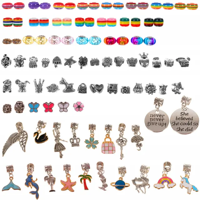 VELIK SET – Komplet 107 elementov bo otroku omogočil ustvarjanje pravljično pisanih zapestnic in verižic v različnih oblikah in z različnimi motivi. V kompletu je bilo priloženih 5 verižic in 5 zapestnic na katere nataknete perle in obeske .