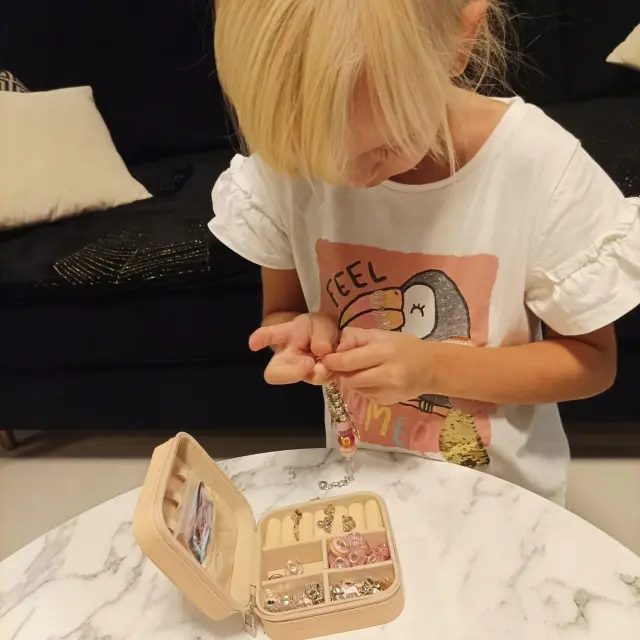 Ustvarjalni komplet za izdelavo zapestnic in verižic z obeski za punčke omogoča otrokom, da uživajo v urah zabave in neskončnih idejah. Ustvariti svoje čudovite zapestnice in ogrlice iz nakita. Otrok lahko razvija lastno domišljijo in ustvarjalnost. Dekleta lahko ustvarijo poljubne kombinacije in konfiguracije zapestnic ali ogrlic.