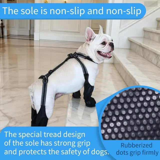 Izboljšana varnost oprijema: Natančno izdelani protizdrsni podplati teh pasjih čevljev zagotavljajo varen oprijem na kateri koli površini, kar znatno zmanjšuje tveganje zdrsov in padcev, zlasti pri starejših psih ali tistih s težavami z gibanjem. Predstavljajte si, da vaš pes samozavestno krmari po spolzkih tleh ali poledenelih pločnikih brez obotavljanja. Izboljšana stabilnost spodbuja zdravje sklepov in preprečuje morebitne poškodbe. Ti čevlji so idealni za notranjo in zunanjo uporabo, saj zagotavljajo neomajno podporo in brezskrbnost, vašemu psu pa omogočajo samozavestno in varno gibanje ne glede na okolje. To je še posebej uporabno pozimi ali v mokrem vremenu, ko so površine lahko še posebej nevarne.