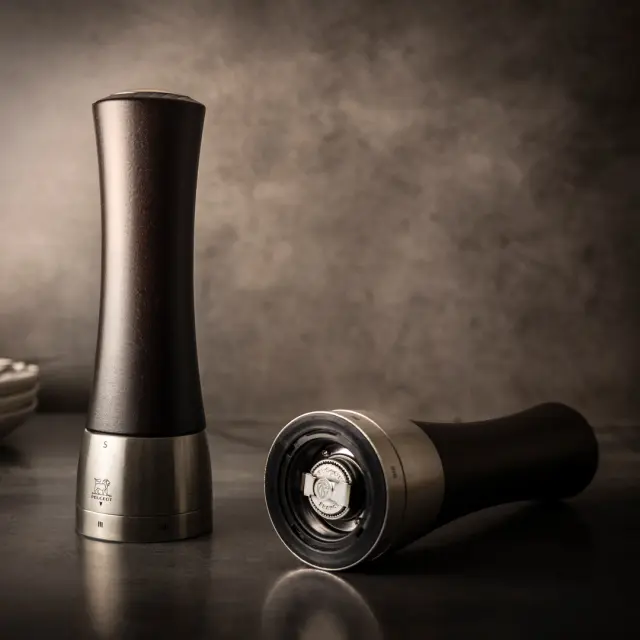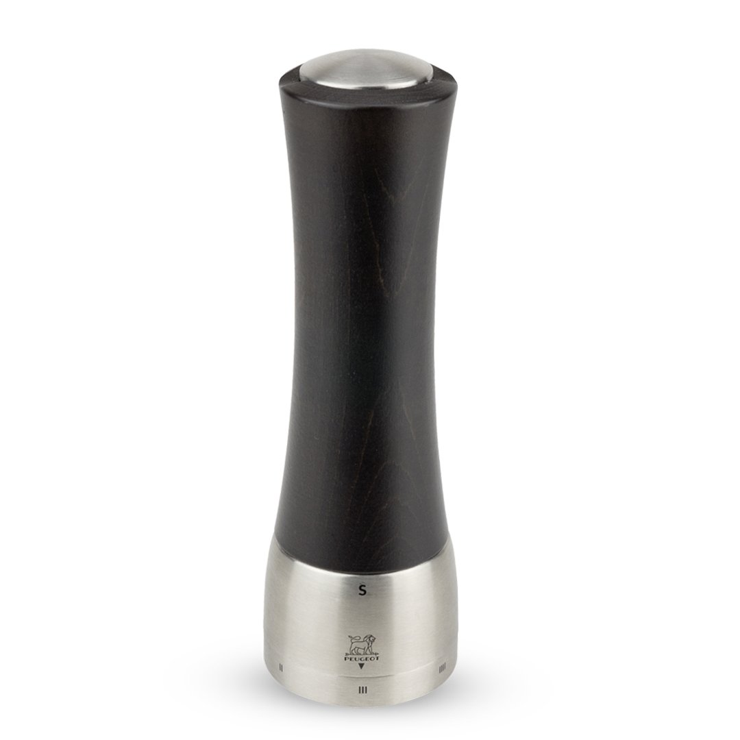 Mlinček za mletje suhe soli Peugeot Madras z bogatim čokoladnim zaključkom je elegantna kombinacija obarvanega lesa in nerjavečega jekla. Mlin Madras se ponaša z inovacijo: odstranitev osrednje navpične gredi. Ta sistem, ki je od zunaj neviden, a bistven za uporabo, omogoča veliko lažje in hitrejše ponovno polnjenje mlinčka; Preprosto odstranite magnetni pokrov na vrhu mlina. Peugeotov patentirani sistem U-Select omogoča popolno nastavljivost mlina od finega do grobega.