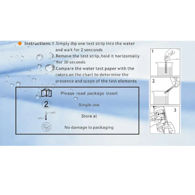 Enostaven za uporabo in branje: preprosto potopite trak v vzorec vode, počakajte nekaj sekund in primerjajte spremembo barve s priloženo barvno tabelo za hitre in natančne odčitke. Ni potrebe po zapletenih nastavitvah ali tehničnem znanju.