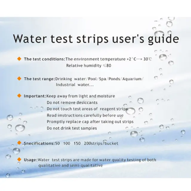 Testiranje širokega razpona: Ti testni lističi za pH ponujajo celovito analizo kakovosti vode z različnimi parametri testiranja, kar vam omogoča natančno oceno ravni pH in drugih pomembnih dejavnikov vašega vodnega vira.