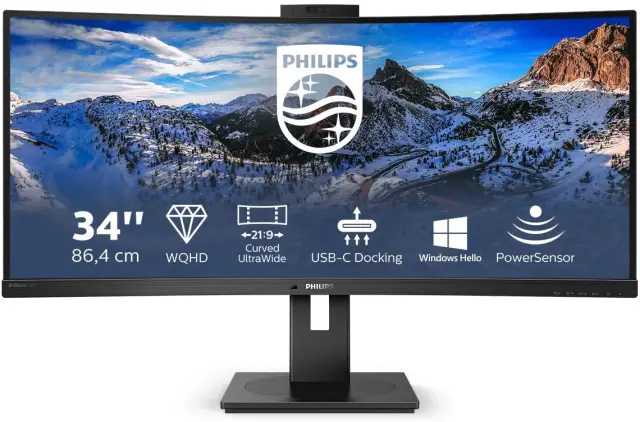 Monitor Philips 86,4 cm (34,0") 346P1CRH 3440x1440 Curved 100Hz VA 4ms HDMI DisplayPort USB-C 90W 4xUSB3.2 HAS Kamera Zvočniki 2H KVM RJ45 HDR400