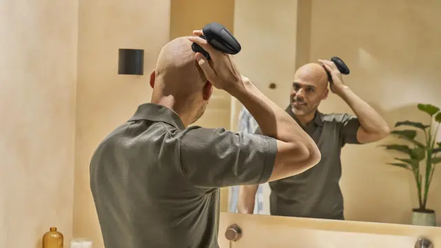 Popolnoma prilagodljiva enota z možnostjo obračanja 360° se prilega linijam glave za optimalni stik s kožo tudi na zahtevnih predelih, kar odpravlja prekomerno pritiskanje, ki lahko povzroči neudobje in draženje.