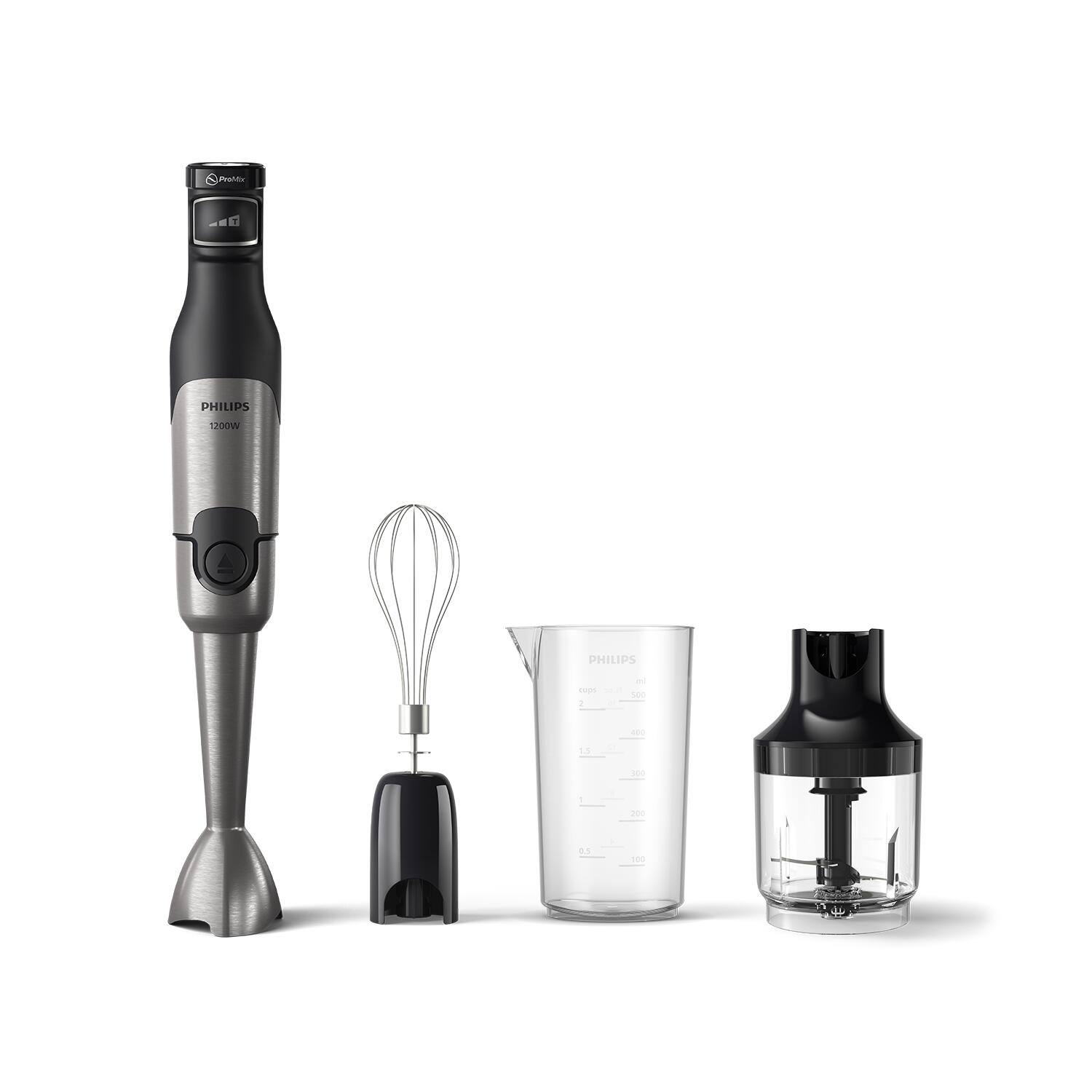 Namestite kompaktni sekljalnik za sekljanje čebule in zelišč, drobljenje oreščkov in še več. S prostornino 0,5 litra je popoln za vsa manjša opravila med pripravljanjem jedi. Z metlico pripravljajte penasto stepeno smetano, svilnato gladko majonezo, popolno maso za palačinke in svoje najljubše solatne prelive. Mešalno palico lahko zamenjate z eno roko s pritiskom gumba. Tako lahko nastavke menjate, ne da bi morali mešalnik odložiti ali umazati pult.