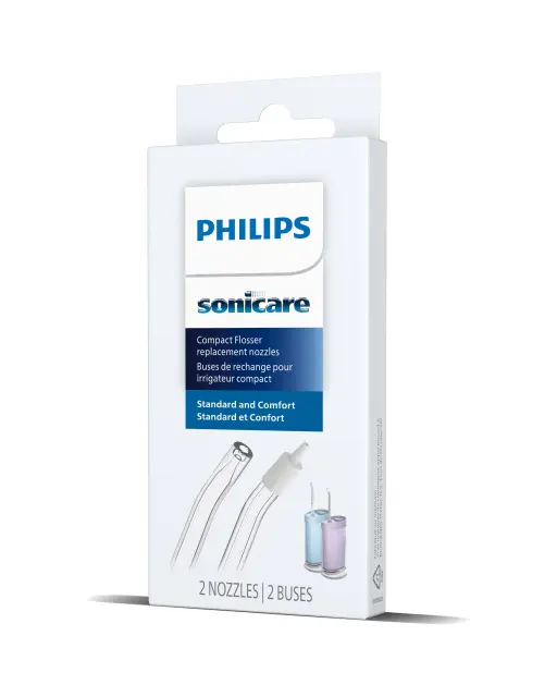 Izkusite hitro in učinkovito čiščenje medzobnih prostorov s temi nastavki za zobno prho Philips Sonicare Compact Flosser. Standardni nastavek zagotavlja učinkovito čiščenje medzobnih prostorov. Nastavek Comfort pa je bil zasnovan posebej za občutljive dlesni in ima nežno konico.