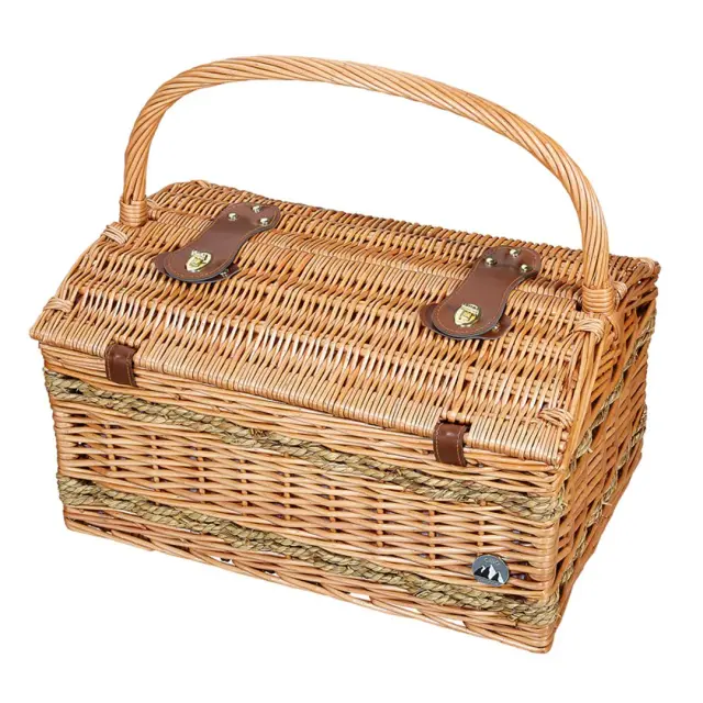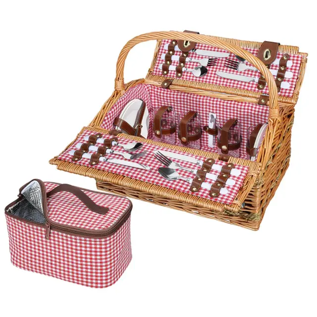Elegantna piknik košara Rivoli iz svetlo rjave vrbe s statičnim velikim ročajem in notranjo prevleko iz tekstila v rdeče-belem karu vzorcu, je opremljena s 4 belimi keramičnimi krožniki premera 18 cm, 4 steklenimi kozarci, 1 odpiračem za steklenice in jedilnim priborom za 4 osebe (žlica, vilica, nož). Košari za piknik je priložena tudi odstranljiva hladilna torba z notranjo srebrno odsevno prevleko, ki poskrbi da vsebina v njej ostane dlje časa hladna. Notranji in zunanji pasovi v imitaciji usnja poudarjajo eleganten videz in poskrbijo, da je v notranjosti vedno vse na svojem mestu. Dimenzija košare: 46x31x41; dimenzija hladilne torbe: 26x15x14 cm