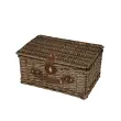 Temno rjava vrbova piknik košara z notranjo podlogo v karo vzorcu in z dodatki (trakovi za zapenjanje) iz umetnega usnja. Košara je opremljena z jedilnim priborom, krožniki in kozarci za 4 osebe.