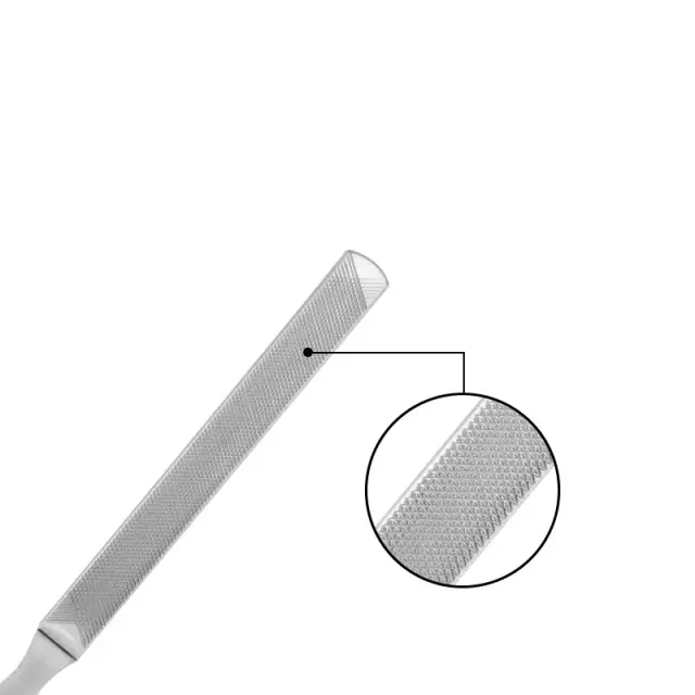Udoben in ergonomičen: 18 cm dolžina in rahlo teksturiran ročaj zagotavljata udoben in varen oprijem, kar olajša manevriranje in nadzor. Ta ergonomska oblika zmanjšuje utrujenost rok in omogoča natančno piljenje tudi na težko dostopnih mestih.