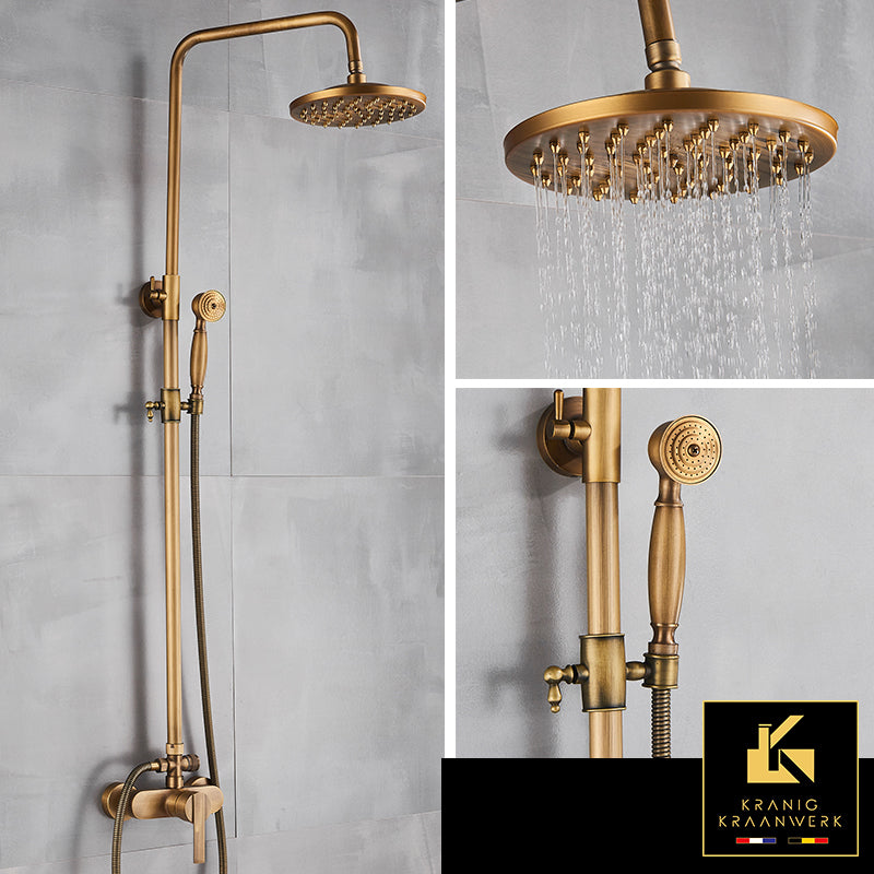 Pipa za prho Ursula. Staro zlato. Tuš set v tradicionalnem in podeželskem slogu razbija včasih prestroge oblike, ki jih najdemo v modernih kopalnicah. Izbirajte med ravnim izlivom ali bolj tradicionalnim in stožčastim modelom tuš glave kot izliv. Nova pipa za tuširanje nudi vaši stranki luksuzno izkušnjo takoj po prvem tuširanju. Kot da bi kopalnica doživela pravo nadgradnjo :-) Konec koncev ostaja pipa prava paša za oči. Na voljo v: Konični izliv: Staro zlato Stožčast izliv: Staro zlato z belimi podeželskimi keramičnimi poudarki Ploščat izliv: Staro zlato Ploščat izliv: Staro zlato z belimi podeželskimi keramičnimi poudarki Enostavna samomontaža na obstoječo cevovod. Dobavljen z vsemi potrebnimi dodatki. Namestitev ali strahovita dela niso potrebna.