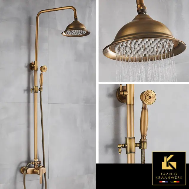 Pipa za prho Ursula. Staro zlato. Tuš set v tradicionalnem in podeželskem slogu razbija včasih prestroge oblike, ki jih najdemo v modernih kopalnicah. Izbirajte med ravnim izlivom ali bolj tradicionalnim in stožčastim modelom tuš glave kot izliv. Nova pipa za tuširanje nudi vaši stranki luksuzno izkušnjo takoj po prvem tuširanju. Kot da bi kopalnica doživela pravo nadgradnjo :-) Konec koncev ostaja pipa prava paša za oči. Na voljo v: Konični izliv: Staro zlato Stožčast izliv: Staro zlato z belimi podeželskimi keramičnimi poudarki Ploščat izliv: Staro zlato Ploščat izliv: Staro zlato z belimi podeželskimi keramičnimi poudarki Enostavna samomontaža na obstoječo cevovod. Dobavljen z vsemi potrebnimi dodatki. Namestitev ali strahovita dela niso potrebna.
