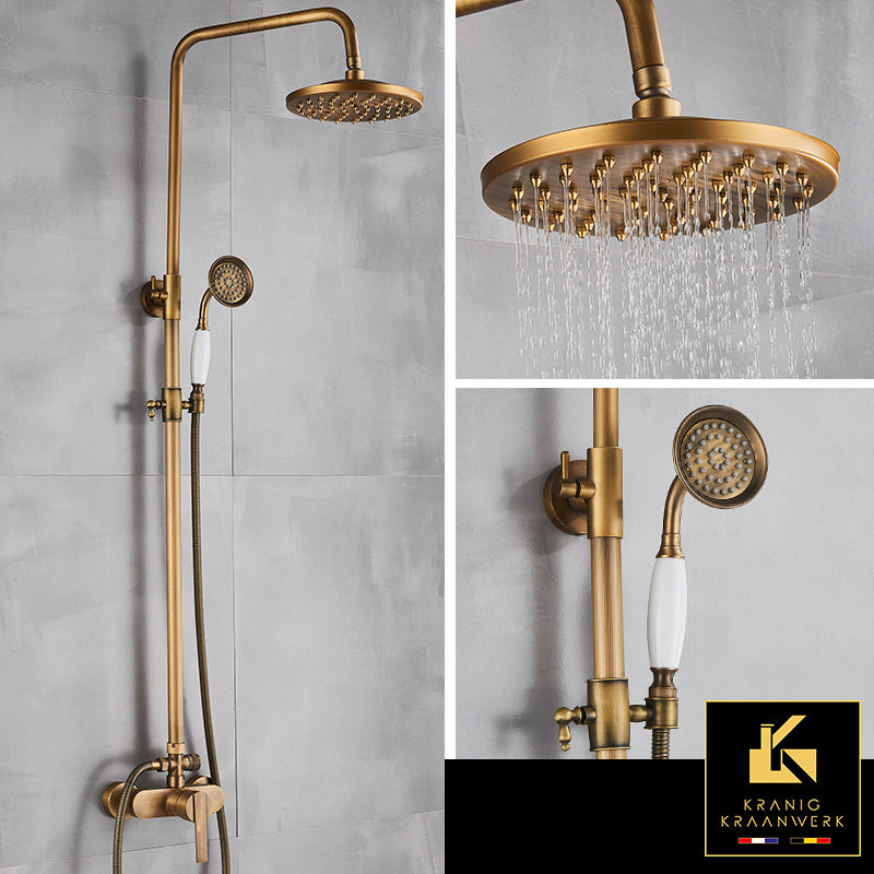 Pipa za prho Ursula. Staro zlato. Tuš set v tradicionalnem in podeželskem slogu razbija včasih prestroge oblike, ki jih najdemo v modernih kopalnicah. Izbirajte med ravnim izlivom ali bolj tradicionalnim in stožčastim modelom tuš glave kot izliv. Nova pipa za tuširanje nudi vaši stranki luksuzno izkušnjo takoj po prvem tuširanju. Kot da bi kopalnica doživela pravo nadgradnjo :-) Konec koncev ostaja pipa prava paša za oči. Na voljo v: Konični izliv: Staro zlato Stožčast izliv: Staro zlato z belimi podeželskimi keramičnimi poudarki Ploščat izliv: Staro zlato Ploščat izliv: Staro zlato z belimi podeželskimi keramičnimi poudarki Enostavna samomontaža na obstoječo cevovod. Dobavljen z vsemi potrebnimi dodatki. Namestitev ali strahovita dela niso potrebna.