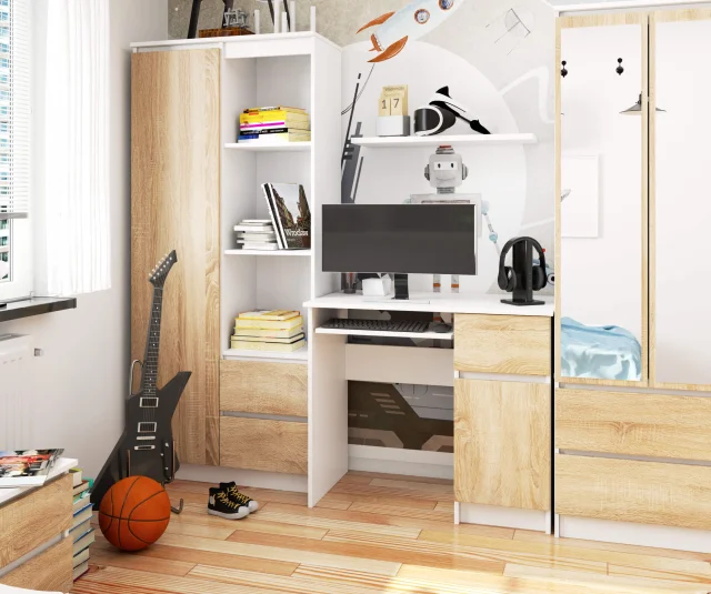 Izdelek, ki ga predstavljamo, je sestavljen iz mizne plošče, izvlečne police za tipkovnico, predala in omare za vrati. Celota je ohranjena v brezčasni barvni shemi. Bela je povezana z minimalizmom in je v zadnjem času pridobila ogromno priljubljenost, ko gre za barvo pohištva, izbranega za moderne notranjosti.