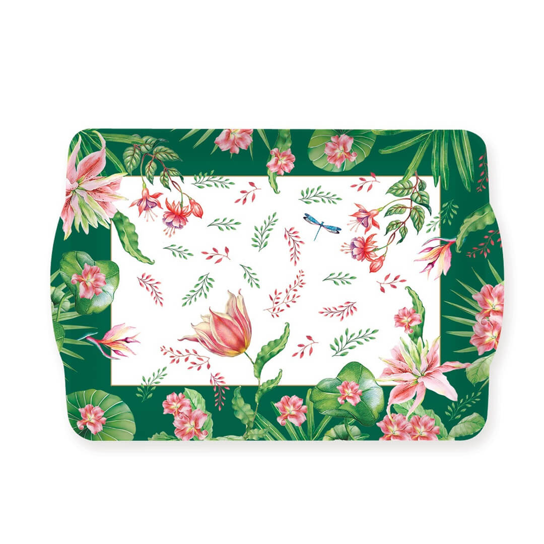 Pladenj (33 x 22 cm) je del linije Botanic Chic, ki združuje funkcionalnost s čudovitim botaničnim dizajnom. Izdelan je iz plastike, ki je lahka, trpežna in enostavna za čiščenje. Linija združuje naravno harmonijo in moderno eleganco, ki je navdihnjena z bujnimi vrtovi, tropskimi cvetlicami in očarljivimi detajli. Pladenj bo prava paša za oči ob postrežbi čaja, zajtrka v postelji ali poletnih osvežitev na terasi. Ročaja omogočata varno in udobno prenašanje. Pomijte ga ročno.