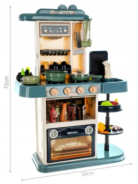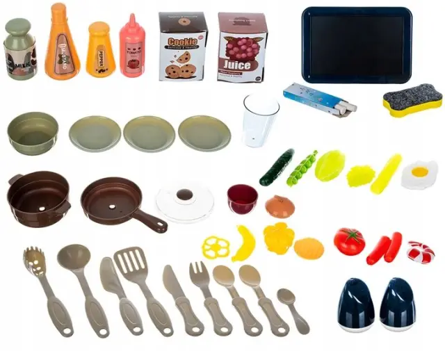 SPECIFIKACIJA – barva: večbarvna; napajanje gorilnikov: 3x AA (ni priloženo); napajalnik nape: 3x AA (ni vključen); število elementov v kompletu: 43; mere kuhinje (dolžina / širina / višina): 23/50 / 72cm; teža kompleta: 2,6 kg; teža z embalažo: 3,2 kg.