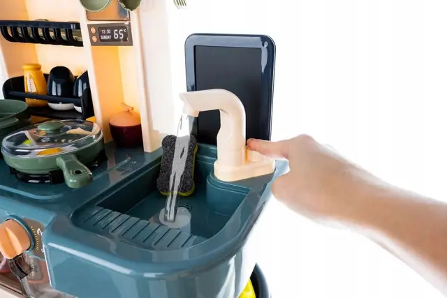 PIPA ZA VODO – vgradili smo pipo v kuhinji s črpalko. Samo natočite vodo v umivalnik, pritisnite črpalko in voda bo pritekla iz pipe! To je zaprt krog. Otrok zna splakniti sadje, zelenjavo in tudi pomiti posodo ! Vse funkcije vzbudijo zanimanje otrok in jih spodbujajo k igri .