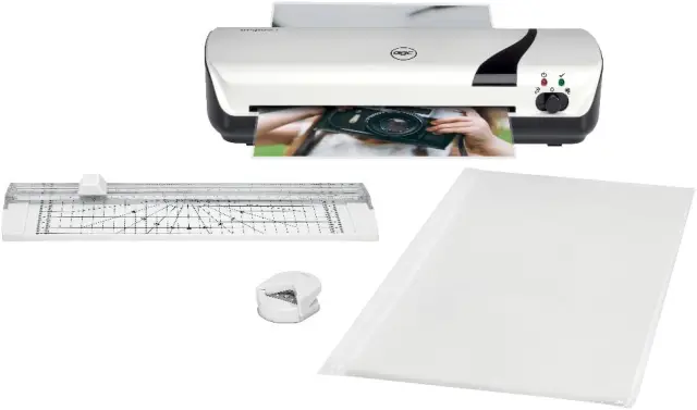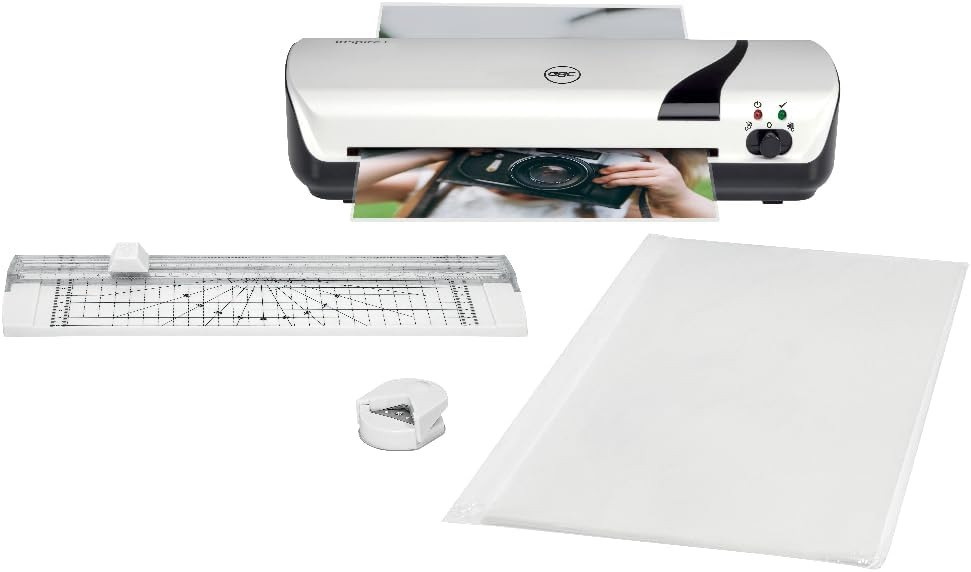 - set vsebuje: 1x GBC Inspire+ A4 laminator (bel), 1x vogalni trimer za obrezovanje ostrih robov in vogalov, 1x rezalnik papirja za preprosto in varno rezanje dokumentov na želeno velikost, 5x začetni paket vrečk za plastificiranje (2x75 mikronov)