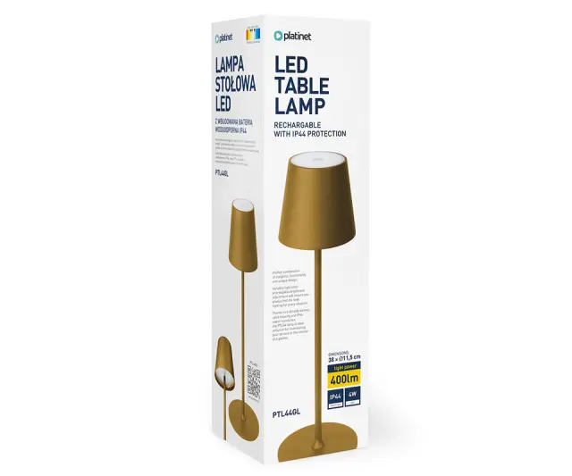PLATINET PTL44GL brezžična namizna LED svetilka, do 400 lumnov, 4000mAh polnilna baterija, IP44 odpornost, USB Type-C, kovina, zlata