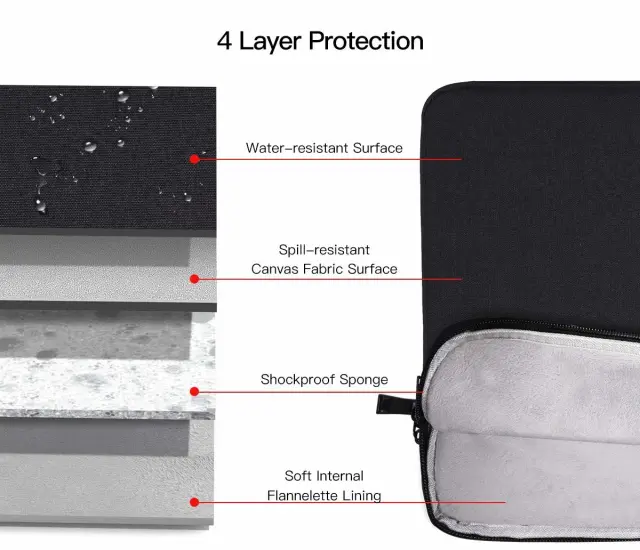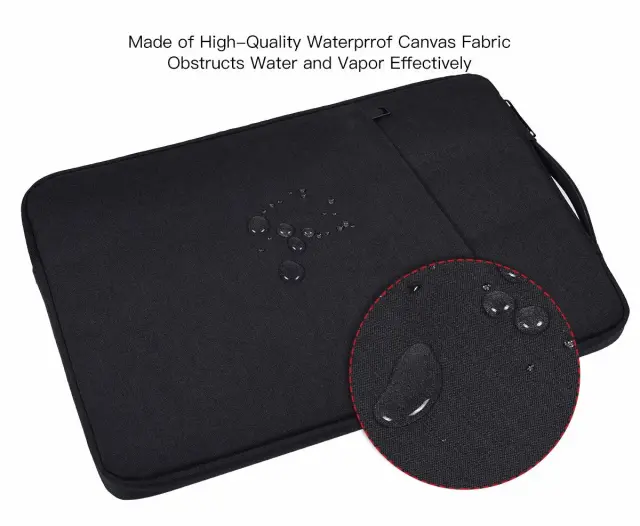 Vodoodporen, lahek in prilagodljiv: torba za prenosni računalnik je izdelana iz visokokakovostnega nepremočljivega platna, tako da je vaš računalnik varno shranjen, tudi če ste na primer zunaj v dežju. Tanka lahka torbica se zlahka prilega drugi torbi, nahrbtniku ali aktovki.